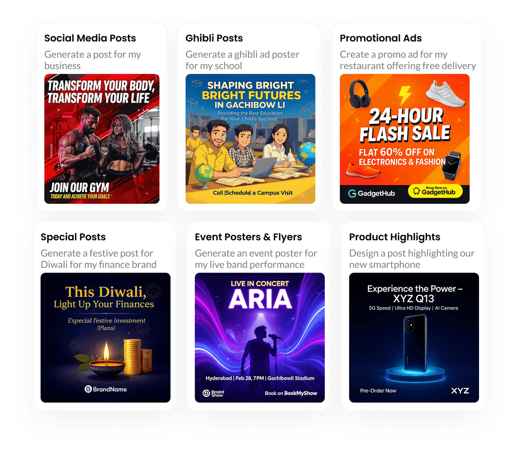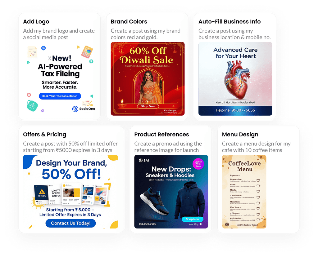 Just type your idea and let ZocialOne create your brand's visuals, ready to publish in seconds.