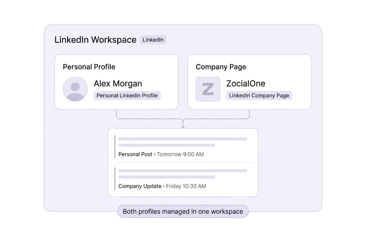 Most tools force you to choose. ZocialOne lets you manage your personal LinkedIn profile and company page from a single workspace — plan, schedule, and analyze both together.