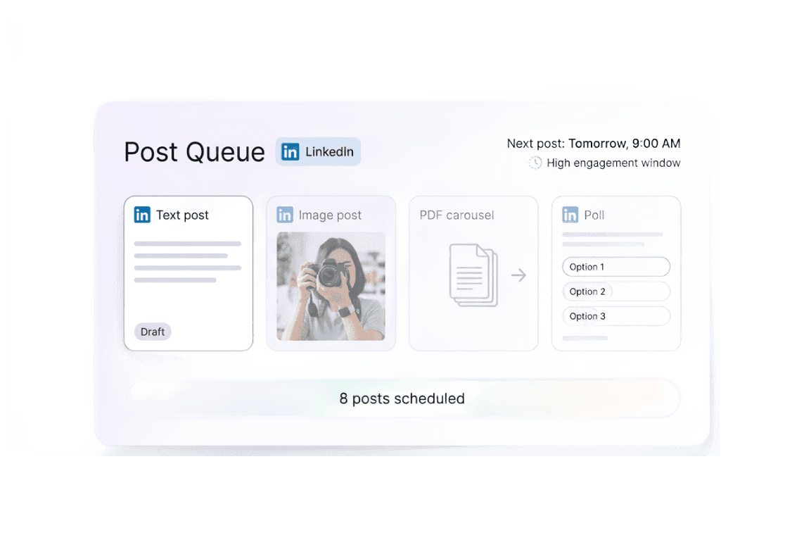 LinkedIn audiences are most active at specific windows during the workweek. ZocialOne identifies the optimal slots based on your audience's behavior — not guesswork.
