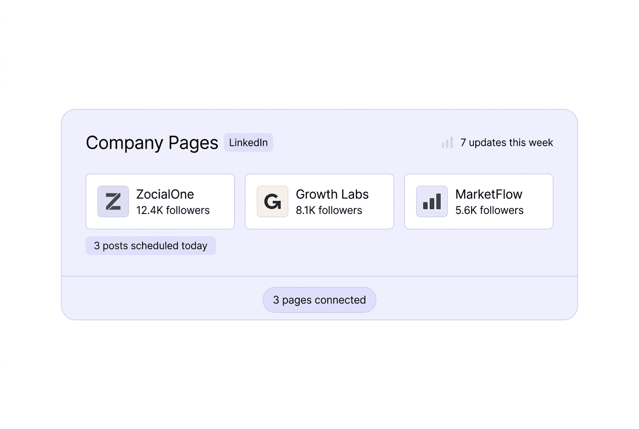 Schedule company updates, thought leadership pieces, job announcements, and product launches — all without logging into LinkedIn multiple times a day. One dashboard, full control.