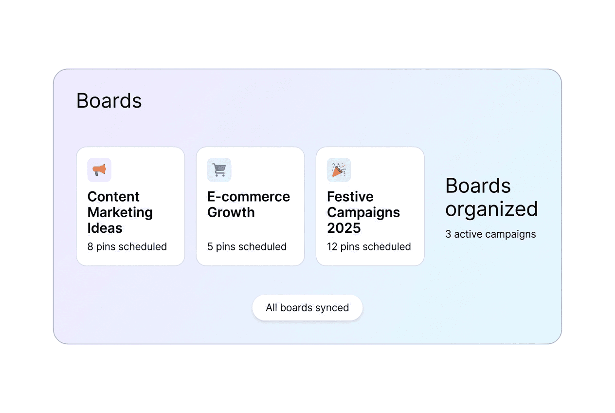 Schedule pins across multiple boards, organize campaigns by theme or season, and manage product launches — all without logging into Pinterest multiple times a day. One dashboard, full control.